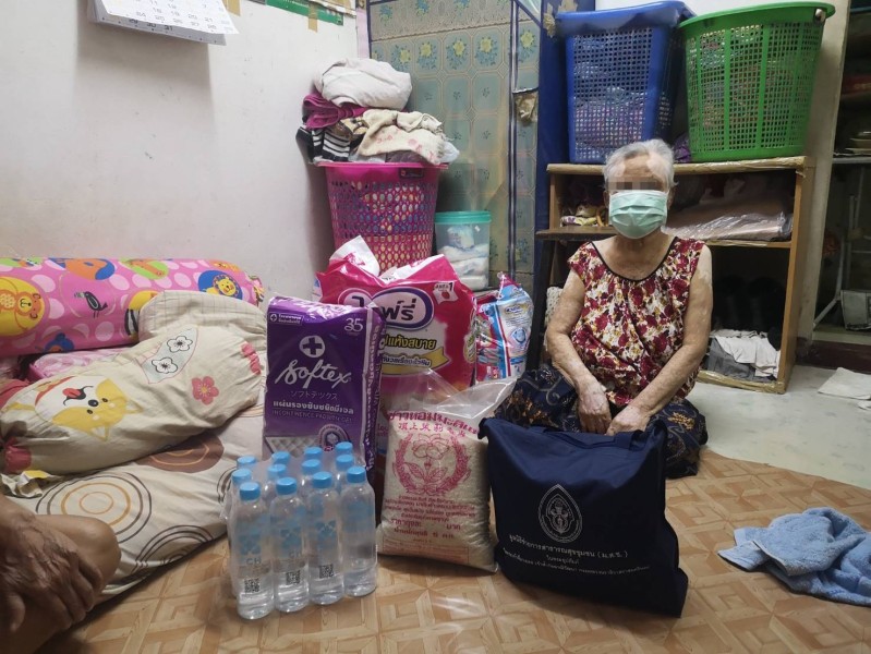 นำถุงยังชีพ ข้าวสาร แพมเพิร์ส น้ำดื่ม ขนม หน้ากากอนามัยผู้ใหญ่และเด็ก มอบให้ผู้ป่วยติดเตียง ผู้สูงอายุ และผู้ยากไร้ในชุมชนแออัด